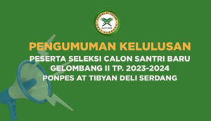 Pengumuman Kelulusan Peserta Seleksi Calon Santri Baru Gelombang 2 Ponpes At Tibyan TP. 2023-2024 Mei 10, 2023 Pengumuman Ujian Tengah Semester (UTS) Tahun pelajaran 2023-2024 September 16, 2023 Segera Dibuka! Pendaftaran Santri/Santriwati Baru Ponpes At Tibyan Deli Serdang Oktober 7, 2023 Telah Dibuka! Pendaftaran Santri & Santri Wati Baru T.P 2024-2025 Gelombang 1 November 2, 2023
